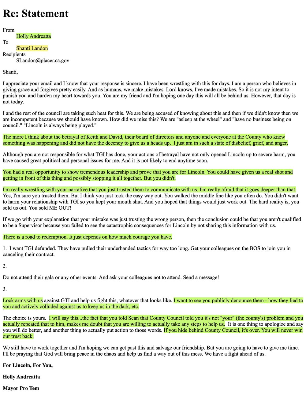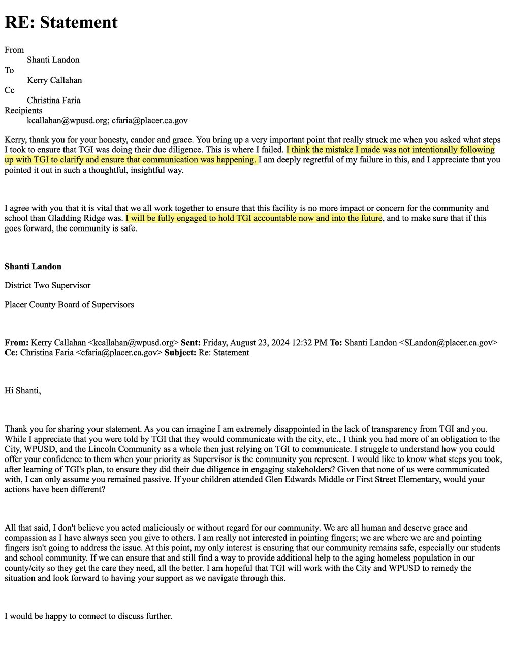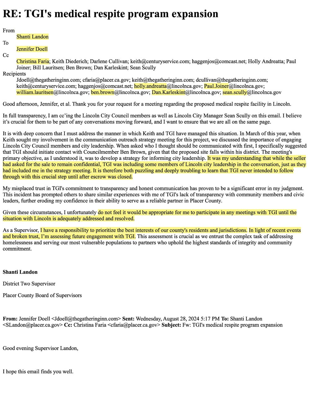 August 2024 — Email from Supervisor Landon to City of Lincoln