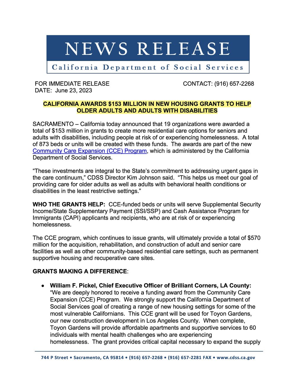 State grant awarded to TGI by California Dept of Social Services as part of Community Care Expansion (CCE) Program.