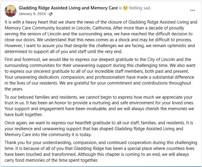 Gladding Ridge Assisted Living shares news of the upcoming closure to the Lincoln facility via Facebook, thanking them for more than a decade of service to Lincoln seniors.