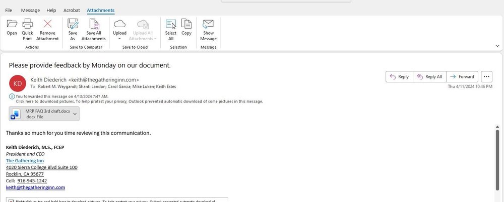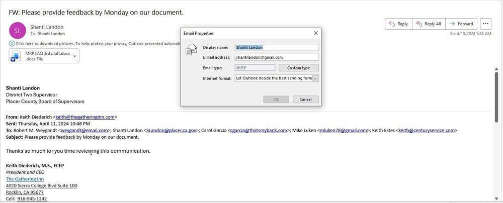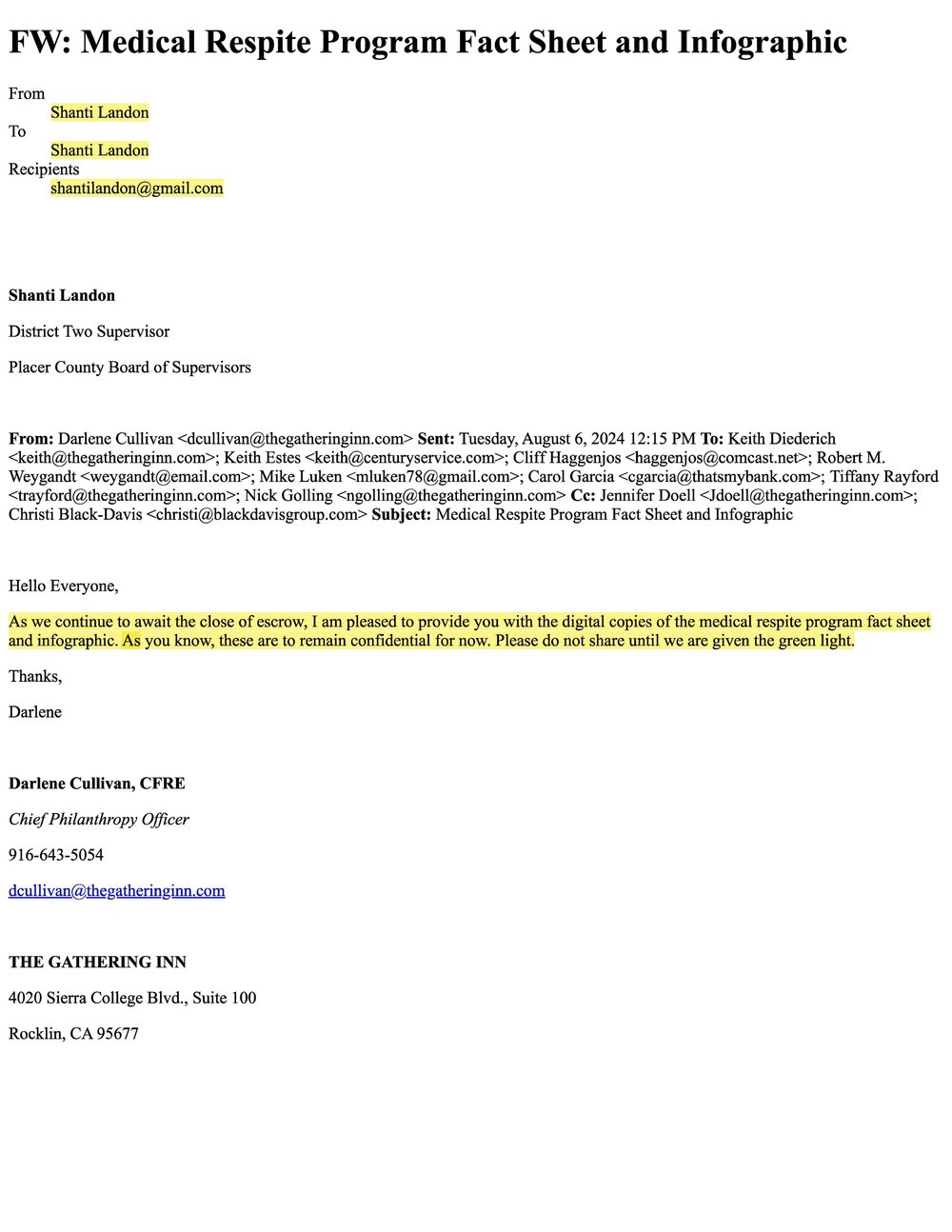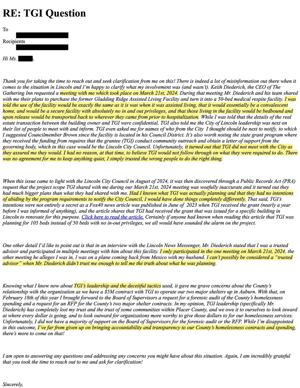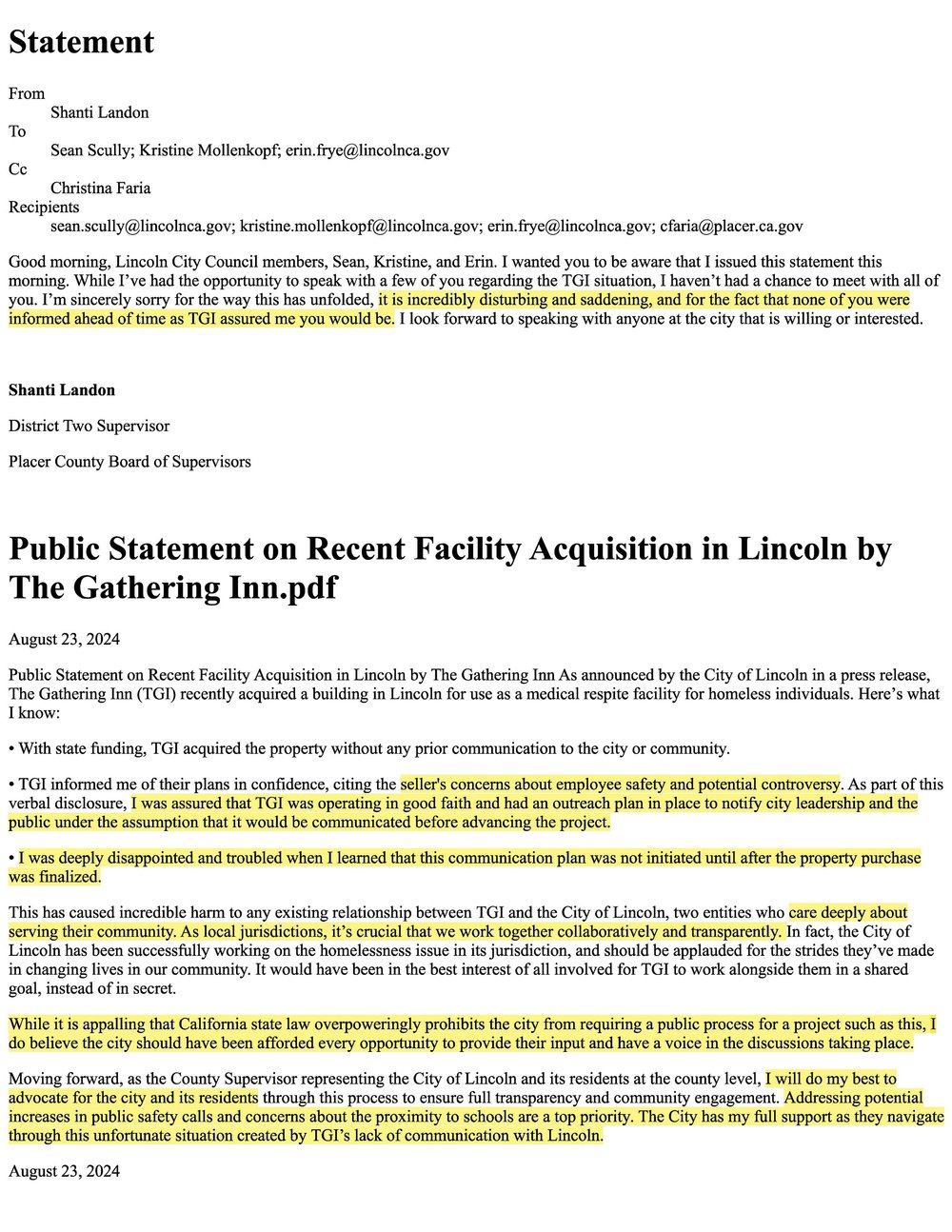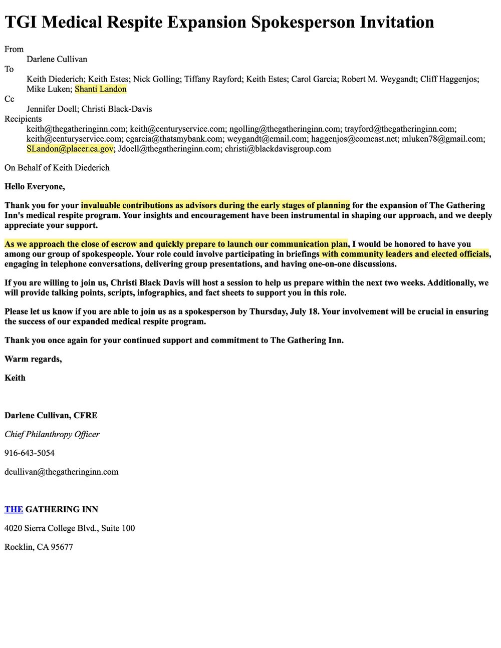 County Supervisor Landon is notified about the proposed homeless facility in Lincoln by TGI and they invite her to attend a "communication outreach strategy meeting."