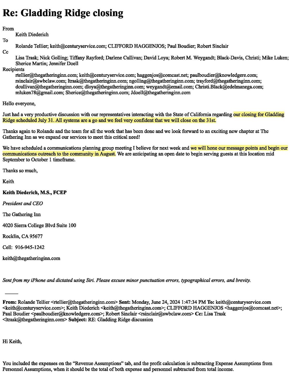 TGI informs Supervisor Landon that escrow is expected to close July 31, 2024, and that they will hone their message points and begin community outreach in August.