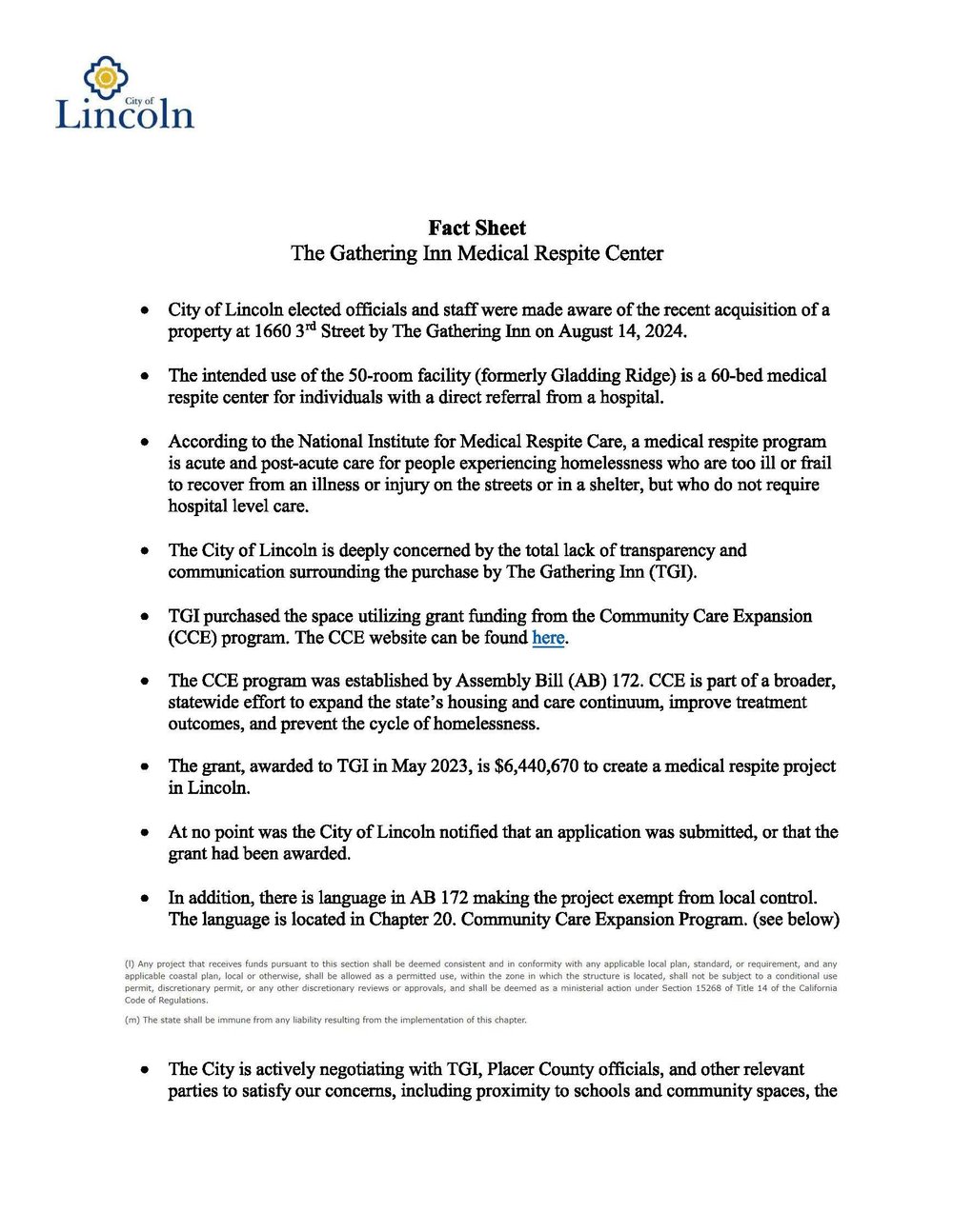 A specific property in Lincoln is purchased for the project at 1660 Third Street (the former Gladding Ridge Assisted Living Facility). City officials are notified after escrow is completed.